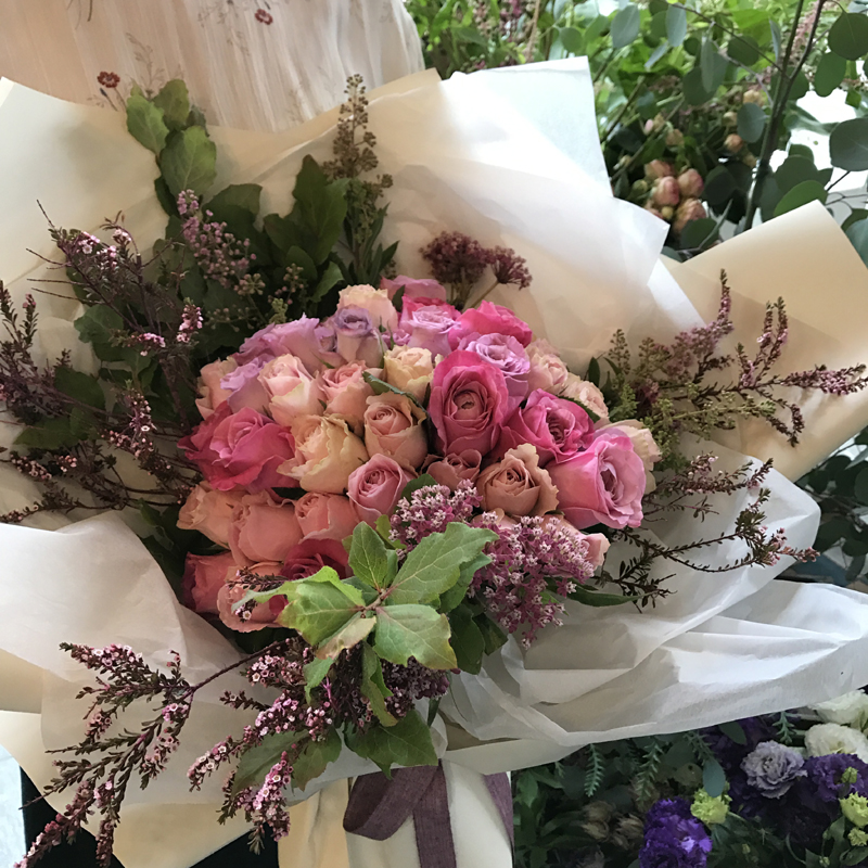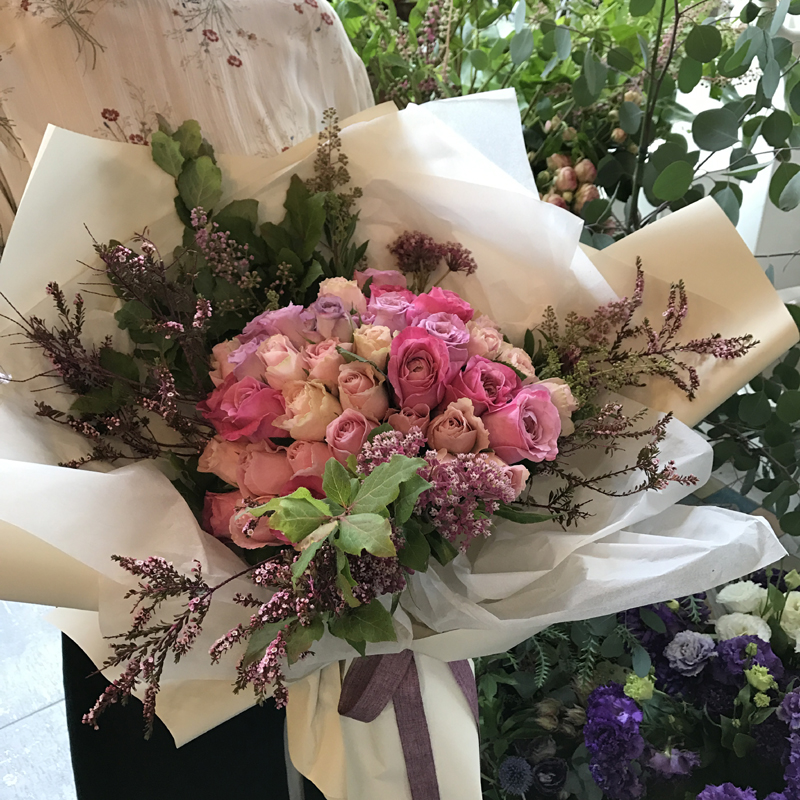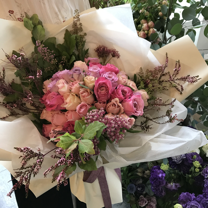 핑크톤의 장미에 소재를 넣어 분위기를 더한 로맨틱한 꽃다발